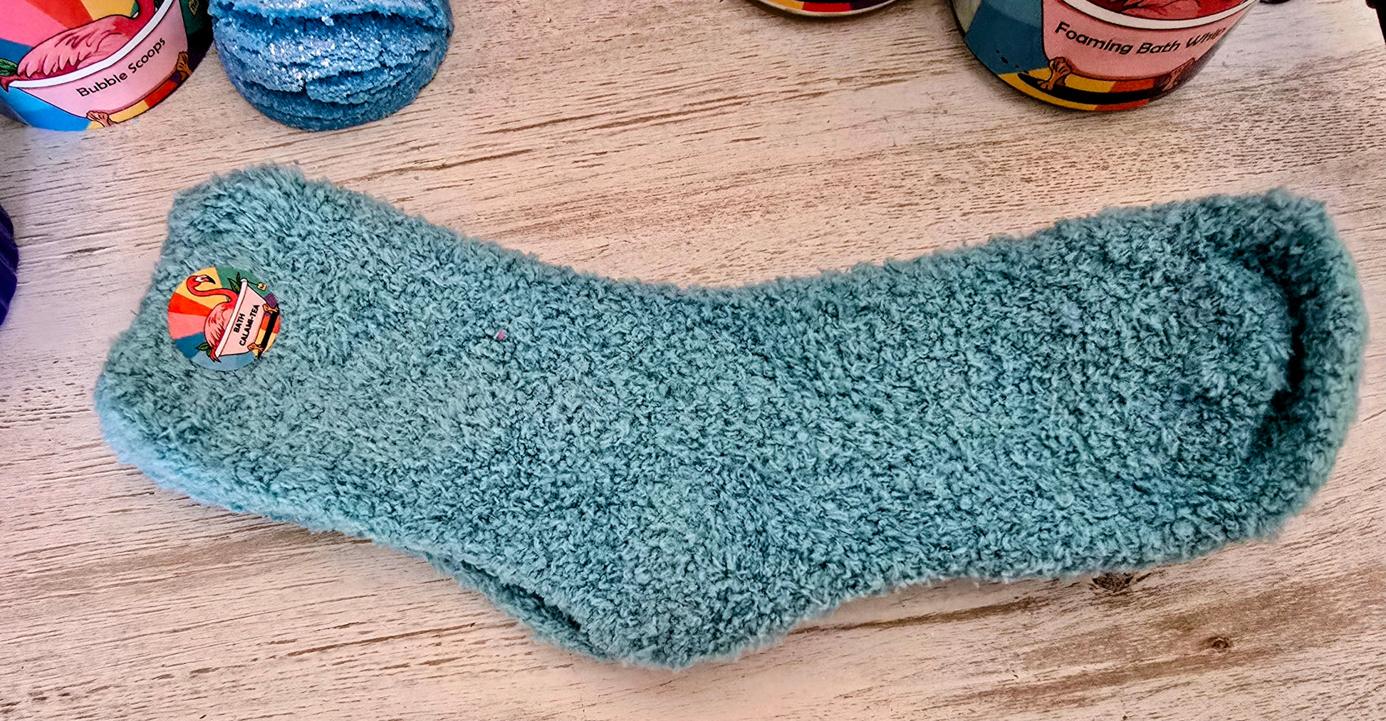 Our Blue gift set includes: Ocean Waves Bath Whip, Candy Hex Body Butter, Cramp relief Bath Tea with flamingo steeper, The Perfect Man Bubble Scoops and a pair of our soft, fuzzy blue spa socks, and carrying bag.